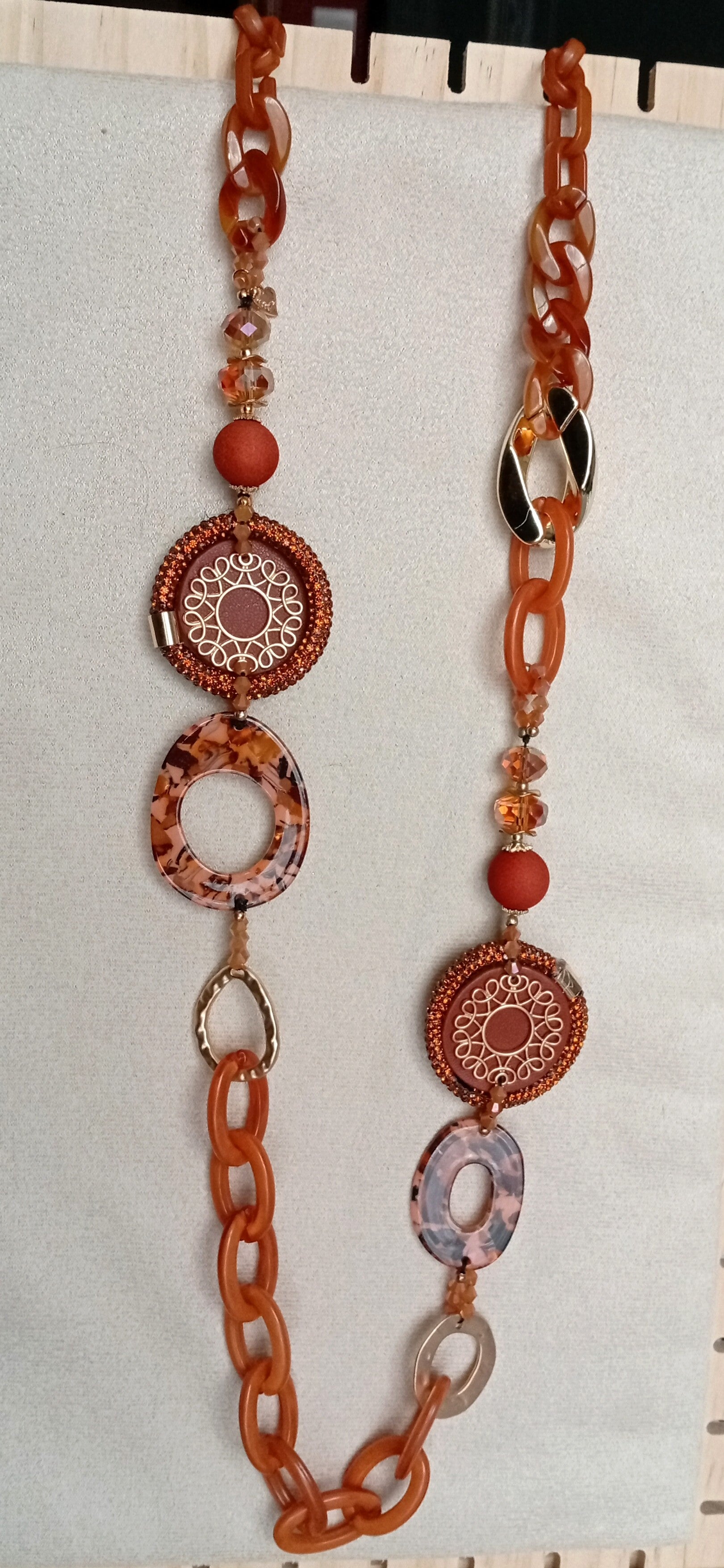 Long collier fantaisie dans les tons de marron/brique.